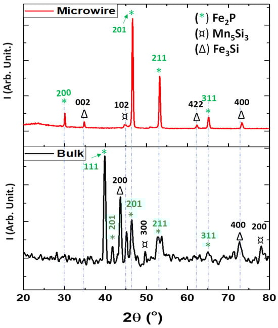 XRD analysis was performed at room temperature to determine the crystalline phase differences between the bulk and glass-coated microwire samples. As illustrated in Figure 3, the XRD analysis shows notable differences between the bulk and microwire samples. The MnFePSi bulk and microwire show different phases, where the main phase is hexagonal Fe2P (space group P-62m) with a space group with cell parameter a= 5.7981 Å, which nearly agrees with that reported elsewhere [49,50]. In addition, the secondary phases with the hexagonal Mn5Si3 structure (P63/mcm) and the cubic Fe3Si structure (Fm-3m), respectively, are found. As seen in Figure 3, the casting and drawing process involved in preparing the MnFePSi glass-coated microwire affects the microstructure compared to the master bulk alloy, in which the strong peak observed at 2θ = 40°, 41.8° and 43.6° are related to the absence of the Fe2P and Fe3Si phases. Furthermore, additional peaks at 2θ = 30° and 34.8° are observed. Moreover, a notable reduction in the Mn5Si3 phase is observed in the microwire sample as compared to the master bulk alloy. These differences in the microstructure and formations of different phases strongly affect the magnetic behavior of the samples as will be discussed in the analysis of magnetic properties. For more information about the average grain size of the corresponding crystalline phase, we used the Debay–Scherrer equation given as follows: