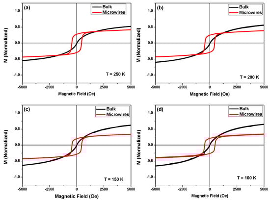 The M-H loops for MnFePSi samples of bulk and glass-coated microwires are measured at a wide range of temperatures (5 K to 250 K). The hysteresis loops are normalized to the corresponding maximum magnetic moments to facilitate a comparative analysis of their magnetic behavior. In Figure 4a–d, selected M-H loops are presented for measuring temperatures between 100 K and 300 K. For measuring temperatures below 100 K, we were not able to obtain regular M-H loops due to the strong contribution of the antiferromagnetic coupling of the Mn5Si3 phase at low temperature. As shown in Figure 4, notable differences between both M-H loops for MnFePSi-glass-coated microwires and bulk samples are clearly evidenced. The microwire sample appears with harder magnetic properties with coercivity, Hc, near 467 Oe as compared to the bulk sample, which shows rather soft magnetic properties with coercivity of about 5 Oe and vanishing magnetic remanence. Accordingly, Hc, the value for MnFePSi-based glass-coated microwires is almost two orders of magnitude higher than the Hc value observed in bulk samples at the same measuring temperature. The same tendency has been observed for all M-H loops that were measured at low temperatures.