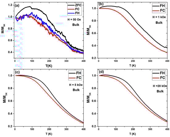 The ZFC, FC and FH curves for bulk MnFePSi samples are presented in Figure 5. From the ZFC, FC and FH magnetization curves, it seems that the Curie point where the transition from ferromagnetic state to paramagnetic state is over 400 K. As reported in the previous works, the transition temperature for MnFePSi alloys can vary from 467 K to 100 K depending on the chemical compositions, annealing condition, secondary phases and fabrication-processing techniques [15,16,17,18,19,20,21,22,23,24,25,26,27]. ZFC, FC, and FH curves measured at a low magnetic field (H = 50 Oe) show a weak signal, where the curves appear very nosey. In addition, notable separation between the curves is seen with irreversible magnetic behavior below T = 100 K (see Figure 5a). For FC and FH magnetization curves, measured at H = 1 kOe, 5 kOe and 20 kOe notable ferromagnetic ordering is seen for the temperature range from 400 K to 5 K, where M/M5K has monotonic increasing by decreasing the temperature from 400 to 5 K (see Figure 5b–d). In addition, the highest separation between the FH and FC curves is observed at the applied external magnetic field at 1 kOe (Figure 5b). However, the curves measured at H = 5 kOe and 20 kOe show almost similar magnetic behavior.