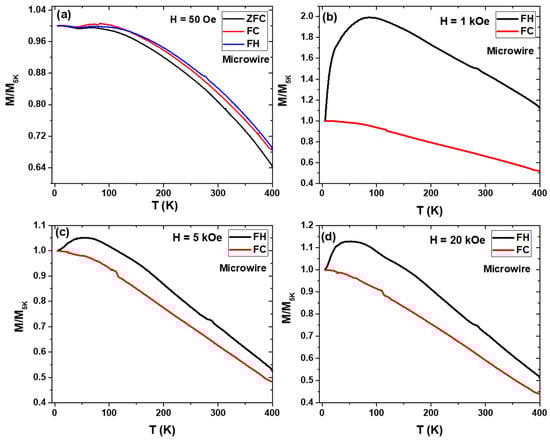 We measured the M/M5K vs. T dependencies for MnFePSi-glass-coated microwire using the same conditions as for the master bulk alloy. The ZFC, FC and FH curves measured at H = 50 Oe show completely different behavior compared to the bulk alloy curves. First, the curves show negative M/M5K values due to the high coercivity (Hc ≈ 467 Oe), and the positive values of M/M5K shown in Figure 6a were obtained after correction by multiplication (−1). The absence of noise in the magnetic signal for the microwire sample must be attributed to the enhancement of the magnetic response of MnFePSi-GCMWs for the low magnetic field compared to the bulk alloy.
