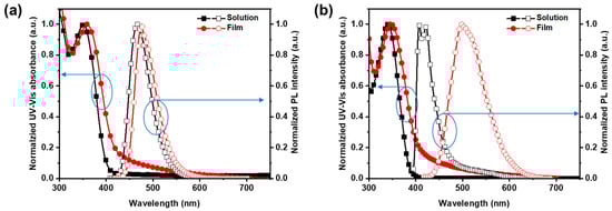 | Solution State a | Film State b | Tg d (°C) | Tm e (°C) | Td f (°C) | PLQY g (%) sol | PLQY g (%) film | HOMO h (eV) | LUMO i (eV) | Bandgap (eV) | |||||