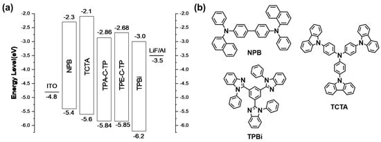 - Tang, C.W.; VanSlyke, S.A. Organic electroluminescent diodes. Appl. Phys. Lett. 1987, 51, 913–915. [Google Scholar] [CrossRef]