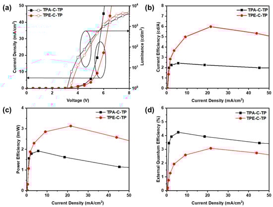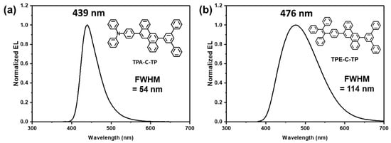 - Shih, P.I.; Chuang, C.Y.; Chien, C.H.; Diau, E.W.G.; Shu, C.F. Highly Efficient Non-Doped Blue-Light-Emitting Diodes Based on an Anthrancene Derivative End-Capped with Tetraphenylethylene Groups. Adv. Funct. Mater. 2007, 17, 3141–3146. [Google Scholar] [CrossRef]