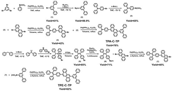 2.2.3. Synthesis of 6-([1,1′:3′,1″-terphenyl]-5′-yl)-12-(4-(1,2,2-triphenylvinyl)phenyl)chrysene—TPE-C-TP