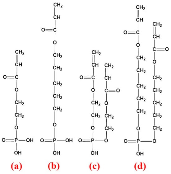 Chemical structure of unsaturated phosphate monomers adopted in synthesis of PCEs: (a,b) the phosphate monoester of MOEP and HPEP; (c,d) the phosphate diester of MOEP and HPEP.