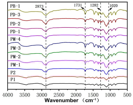 Figure 2 exhibits FT-IR spectra of comb-like and hyperbranched PCEs. The new adsorption bands at 1020 cm−1 are ascribed to the C-N group of the DMAEMA units. The new peak at 1282 cm−1 is assigned to the P=O deformation vibration. PM-4 and PD-3 had a stronger absorption peak than others at 842 cm−1 due to the HPEP over three methylene than MOEP.