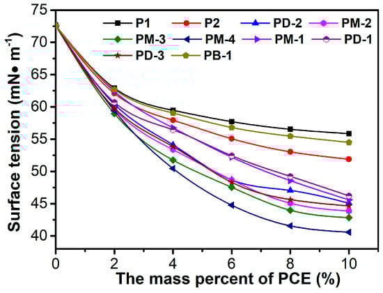 The surface tension of the PCEs’ solution is shown in Figure 3. In reality, the surface tension of the PCEs’ solution correspondingly decreased with the concentration of the increased PCEs’ solution. The surface tension of the PCEs followed the order of PM-4 < PM-3 < PM-2 < PD-3 < PD-2 < PM-1 < PD-1 < P2 < PB-1 < P1. For the surface tension of the PM series of PCEs, with the increases of the phosphate diester, the surface tension gradually decreased, indicating that the cross-linked structure cladded the hydrophilic groups. PM-4 had stronger hydrophobicity than others due to the HPEP having over three methylene more than MOEP. The effect of the phosphate monoester on surface tension was also investigated. It can be concluded that the decrease of the phosphate monoester induced a decrease in surface tension due to the declined anchor groups, the weakened steric repulsive force, and the increased intermolecular and intramolecular molecules aggregation tendency. This conclusion further supported the relationship between the branching degree and intramolecular and intermolecular forces.