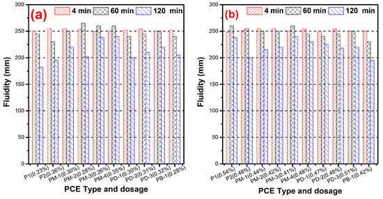 Dispersing ability of PCEs at w/c = 0.29 (a) and w/c = 0.20 (b).
