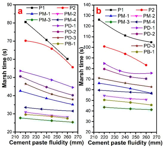 Marsh time of cement paste with different fluidity for PCEs at w/c = 0.29 (a) and w/c = 0.20 (b).