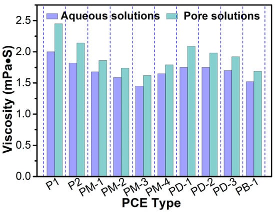 Effect of PCEs type on the viscosity of the aqueous (pH was 6.5) and simulated pore solutions (pH was 12.2).