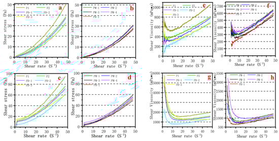 Effect of PCEs type on rheology of cement paste: (a,b,e,f) at w/c = 0.29; (c,d,g,h) at w/c = 0.20.