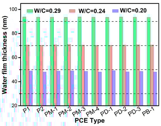 Figure 8 presents the effect of w/c ratio on the water film thickness. Cleary, the water film thickness decreased with the decrease of the w/c ratio due to the decrease of space between particles when the w/c ratio was reduced. The lower space between particles will amplify the van der Waals forces among particles, compressing the water film thickness. It is interesting that the WFT was determined by the w/c ratio and had no relation with the type of PCE.