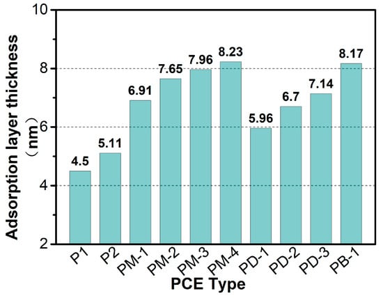 Figure 9 presents the adsorption layer thickness of PCEs on the nano silica surface. Apparently, the thickness of the adsorption layers of the hyperbranched PCEs was greater than that of the comb-like PCEs, and the adsorption layer thickness increased when the branching degree of PCEs increased. However, PM-4 had the thickest adsorption layer thickness, which may be explained by the fact that the adsorption of PM-4 on the particle surface with residual PM-4 effects was prone to intermolecular hydrophobic associations to form a mixed aggregate. The adsorption layer thickness of PB-1 without a phosphate anchoring group was also thicker due to the high degree of branching and the intermolecular and intramolecular hydrogen bond formed by the introduced N and O. For the effect of phosphate monoester on the adsorption layer thickness, it indicated that the more the number of strongly adsorbed anchoring groups, the greater the adsorption layer thickness of PCE. It was interesting that the thicker adsorption layer thickness of PCEs had an excellent viscosity-reducing performance. However, although PM-4 had the thickest adsorption layer thickness, the viscosity-reducing performance of PM-4 was worse than that of PM-3, which may be because the intrinsic viscosity of PM-4 was too high and there were too many intermolecular hydrophobic associations.