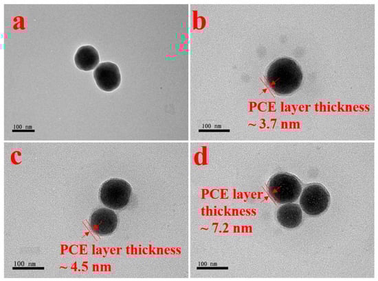 To further verify the adsorption layer thickness on the particles’ surfaces, the morphology of the adsorption layer, revealed by TEM observation (see Figure 10), indicated that the thickness of the adsorption layers of hyperbranched PCEs was greater than that of comb-like PCEs. The adsorption layer of PM-3 was the thickest due to the high branching degree of PM-3 and the strong adsorption anchoring groups. Meanwhile, the mean adsorption layer thickness of PCEs from DLS was larger than that from TEM due to the hydrated layer formed on silica-CSH with PCE.