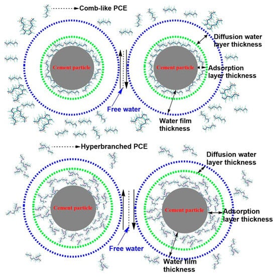 The thicker the adsorption layer thickness, the thinner the diffusion water layer thickness. A thinner water diffusion layer thickness increased the amount of free water and improved the flowability and reduced the viscosity of cement paste. The hyperbranched PCEs led to a smaller occupying area and a higher amount to obtain the required paste spread, the hyperbranched PCEs had a thicker adsorption layer thickness, and the diffusion water layer thickness was compressed. Meanwhile, the hyperbranched PCEs were imbedded with stronger anchoring groups of hydrophobic phosphate ester structure, significantly decreasing the water content of adsorption layer thickness and resulting in the release of more free water, which indicated that the lower viscosity was obtained. The intrinsic viscosity of hyperbranched PCEs and the viscosity of aqueous solutions containing the hyperbranched were lower than that of comb-like PCE, thus lowering the entanglement effect of the side groups or chains on the polycarboxylate-based polymer backbone and decreasing the viscosity of pore solutions in the cement paste.