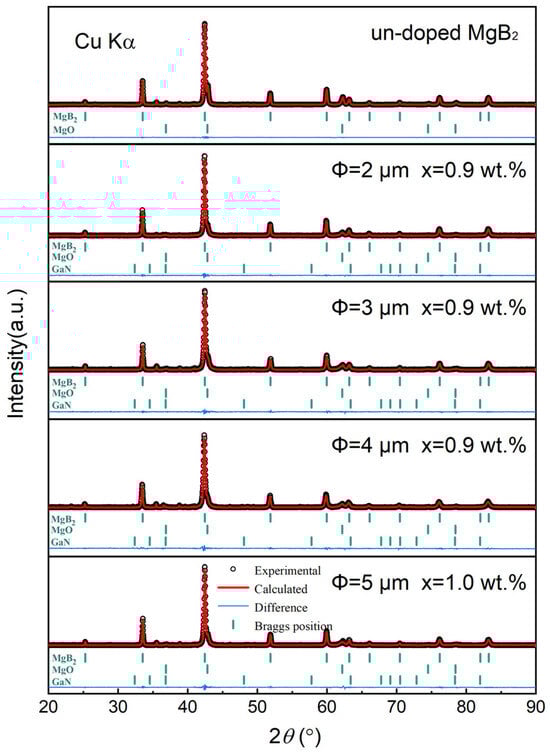 Figure 2 shows the refined X-ray diffraction (XRD) patterns of the pure MgB2 sample and inhomogeneous-phases-added MgB2 samples with different sizes of p-n junction particles. The XRD patterns reveal that the main peaks of the samples correspond to the MgB2 phase, with minor amounts of MgO and GaN phases present. The specific contents are summarized in Table 1. The pure MgB2 sample contains 91.87% MgB2 as the superconducting phase and 8.13% MgO as the sole impurity phase. After adding the inhomogeneous phases and sintering, there is little change in the volume fraction of MgO impurity. For all samples, the MgO phase mainly originates from MgO impurities in the MgB2 raw materials and unavoidable oxidation during sample preparation. Therefore, the maximum change in the volume fraction of MgO among the four samples is only 0.16%. Additionally, Table 1 provides information on the lattice parameters of all samples. The lattice parameters of pure MgB2 are a = 3.08532 Å and c = 3.52317 Å, which align well with the standard MgB2 lattice data. When adding with inhomogeneous phase particles and sintering, there is no significant shift or change in the lattice parameters of the samples, and their XRD diffraction peaks do not exhibit any noticeable shifting trend. This indicates that our inhomogeneous phase particles are located between the MgB2 particles, and there is no elemental substitution phenomenon to perturb the MgB2 lattice, which is also confirmed by the absence of new peaks in the XRD diffraction pattern.