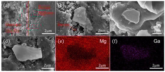 SEM images of (a) the pure MgB2 sample, (b) 0.9 wt.% 3 μm inhomogeneous-phase-added sample, (c) 0.9 wt.% 2 μm inhomogeneous-phase-added sample, (d) 0.9 wt.% 4 μm inhomogeneous-phase-added sample, (e,f) EDS mapping of Mg and Ga.