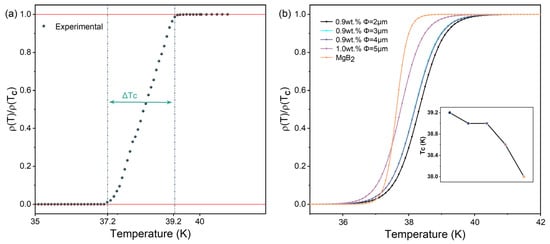 (a) Normalized resistivity curves of MgB2 + 0.9 wt.% 2 μm p-n junction electroluminescent particle sample. (b) Normalized resistivity curves of all samples; the illustration shows the TC variation trend of the sample.