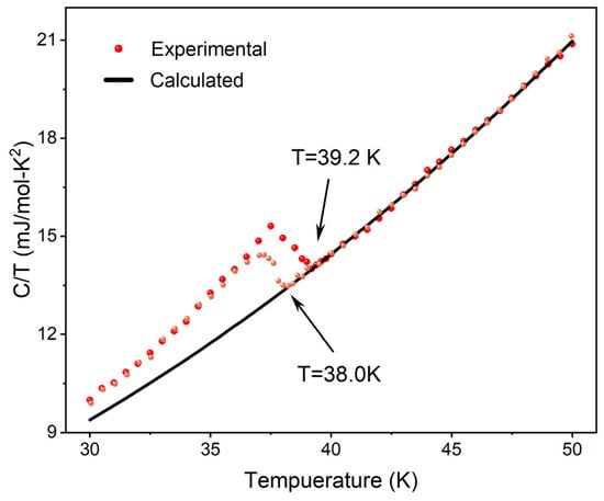 Specific heat is a significant thermodynamic quantity frequently employed in the study of superconducting materials to obtain information regarding electronic structure, lattice vibrations, and conduction transition properties [25,26]. By measuring the specific heat as a function of temperature for both the pure MgB2 sample and those added with 2 μm-sized luminescent inhomogeneous phases under an applied magnetic field of 0 T, further exploration into the superconductivity of p-n junction electroluminescent-inhomogeneous-phase-added superconductors was conducted. Figure 5 illustrates the jump in specific heat data at TC = 39.2 K for the inhomogeneous-phase-added samples and at TC = 38.0 K for the pure MgB2 sample, indicating the emergence of superconducting phenomena, consistent with resistivity measurement results and corroborated by other reports [27]. Regarding the specific heat data for MgB2, our particular interest lies in the electronic specific heat portion. Therefore, when the temperature is significantly lower than the material’s Debye temperature, we employed the Debye relation to fit the experimental data, , where is the Sommerfeld coefficient, and is the lattice constant. The fitting of the data yielded parameters . The lattice constant parameter can also provide information regarding phonons, allowing for the calculation of the Debye temperature . By employing , where N is the number of atoms per unit substance and k is the Boltzmann constant, the calculated value of is 930 K, consistent with data reported in the literature [28,29,30].