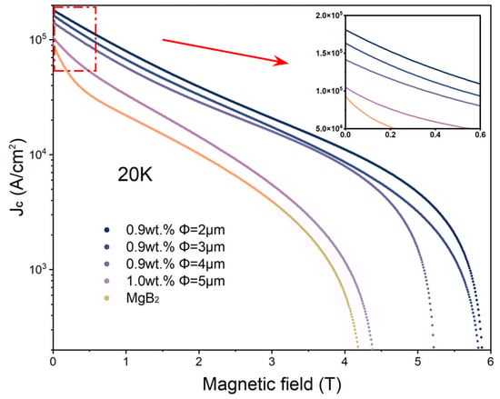 Figure 6 illustrates the variation in critical current density with a magnetic field for both the pristine MgB2 sample and the p-n junction electroluminescence (EL)-inhomogeneous-phase-added sample. This curve is calculated using the Bean critical state model from the hysteresis loops obtained at 20 K [23]. The inhomogeneous-phase-added sample exhibits enhancement across the entire field range, with the 2 μm-inhomogeneous-phase-added sample demonstrating the most favorable performance. At zero applied magnetic field, the critical current density (JC) of the pristine MgB2 sample is 9.27 × 104 A/cm2, while the 2 μm-inhomogeneous-phase-added sample exhibits significantly improved JC, approximately 1.81 × 105 A/cm2, representing a notable enhancement over the pristine sample. As the external magnetic field increases, the enhancement in critical current density due to inhomogeneous phase adding becomes increasingly pronounced. At 3 T magnetic field, the JC values for the pristine MgB2 sample and the 2 μm-inhomogeneous-phase-added sample are 3.93 × 103 A/cm2 and 2.08 × 104 A/cm2, respectively, differing by several orders of magnitude. The pristine MgB2 samples experience a sharp decrease in JC with increasing applied magnetic field due to the lack of effective pinning centers. In contrast, the addition of inhomogeneous phases can be regarded as the introduction of strong flux-pinning centers, effectively enhancing the upper critical magnetic field strength and the number of effective pinning centers of MgB2, thus improving its current carrying capacity at high fields [31,32]. With the reduction in the size of the inhomogeneous phases, the added samples exhibit better flux-pinning capability and high-field performance. This indicates that the addition of inhomogeneous phases can effectively enhance the critical current density (JC) of MgB2 superconducting materials, and the smaller the size, the greater the number of accommodated inhomogeneous phases, resulting in a greater enhancement effect.