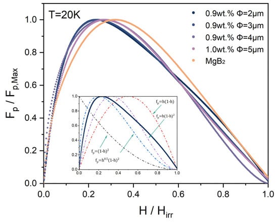 Figure 7 presents the normalized pinning force (Fp/Fp,max) as a function of field (h = H/Hirr) for both added and pure MgB2 samples at 20 K. The inset in Figure 6 illustrates the scaling behavior of fp using the Dew-Hughes model, where the solid line represents the normalized pinning force curve of our optimal sample, S1. To delve deeper into comprehending the pinning mechanism within the samples and to gauge the primary pinning centers, we adopted scaling functions introduced by Dew-Hughes, which are widely utilized for characterizing the pinning mechanisms observed in type-II superconducting bulk materials [33]. The pinning behavior can be dissected through an analysis of the normalized flux-pinning force density, denoted as fp, defined as follows: