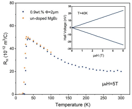 The temperature dependence of the Hall coefficient for both the pure MgB2 sample and 0.9 wt.% 2 μm-inhomogeneous-phase-added samples is shown in Figure 8. The two curves in the inset represent the Hall voltage measured for the 0.9 wt.% 2 μm-inhomogeneous-phase-added sample under a reverse magnetic field of up to 5 T at 40 K. The apparent symmetry and linearity of the curves indicate good alignment of the Hall electrodes, ensuring the reliability of our measurements. It can be observed that within the temperature measurement range, the Hall coefficients of the samples are all positive, and as the temperature decreases towards TC, the Hall coefficient continuously increases; especially after the temperature drops below 150 K, the rate of increase significantly accelerates. This suggests that the scattering rates of the two bands in the MgB2 sample have different temperature dependencies, resulting in a pronounced temperature dependence of its RH. At 40 K, the Hall coefficient for the pure MgB2 sample is RH = 4.62 × 10−11 m3/C, with a hole carrier density of 1.35 × 1023 cm−3, indicating that MgB2 is a metallic superconductor, and the average value of RH is consistent with previous experimental reports [38,39]. A sharp step-like transition in the Hall coefficient can be observed when the temperature is below TC. The Hall coefficient of the added sample also exhibits strong temperature dependence, which is generally consistent with the trend of the pure MgB2 sample. Compared to the pure MgB2 sample, the sharp transition in the Hall coefficient of the added sample near TC occurs earlier, indicating the earlier entry into the superconducting state of the added sample. Its Hall coefficient slightly decreases, which may be related to the slight increase in carrier concentration introduced by the introduction of the inhomogeneous phase.