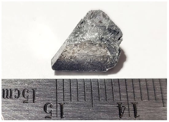 Single-crystalline samples were synthesized from a Zn-rich self-flux, employing the growth procedures outlined by Torikachvili et al. [43]. Elements with purities greater than 99.9% were loaded into 2 mL Canfield alumina crucibles [44] with a molar ratio of 1(Yb):2(Co, Ni):60(Zn). The crucibles were sealed under vacuum in 2 mm thick quartz tubes, heated to 1050 °C at a rate of 50 °C/h, and held at that temperature for 72 h. Next, the ampules were cooled down to 700 °C at a rate of 2 °C/h and held at that temperature for another 72 h. Finally, at 700 °C, the excess flux was removed by centrifuging, after which crystals with dimensions of several millimeters were collected. Figure 1 shows the as-synthesized YbCo1.86Ni0.14Zn20 single crystal.
