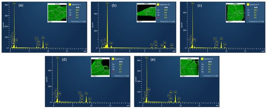 EDS spectrum of (a) x = 0.1, (b) x = 0.14, (c) x = 0.2, (d) x = 0.5, and (e) x = 1 for Zn20. The insets show the elemental mapping of Ni as an example and the atomic percentages of all elements detected in the selected spectrum.