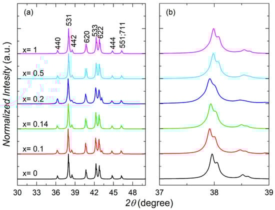 Zn20 crystalizes in the same space group, -3m (#227), as the other 1-2-20 compounds [46,47,48,49]. The X-ray diffraction peaks from 2 = 30° to 50° are shown in Figure 3a, and the zoomed-in peaks from 37° to 39° are shown in Figure 3b. The peak positions across the doping series only show slight to negligible shifts. This is as expected since the atomic radii of Ni and Co are very similar [50], suggesting that this type of chemical substitution has a minimal impact on the lattice constant.