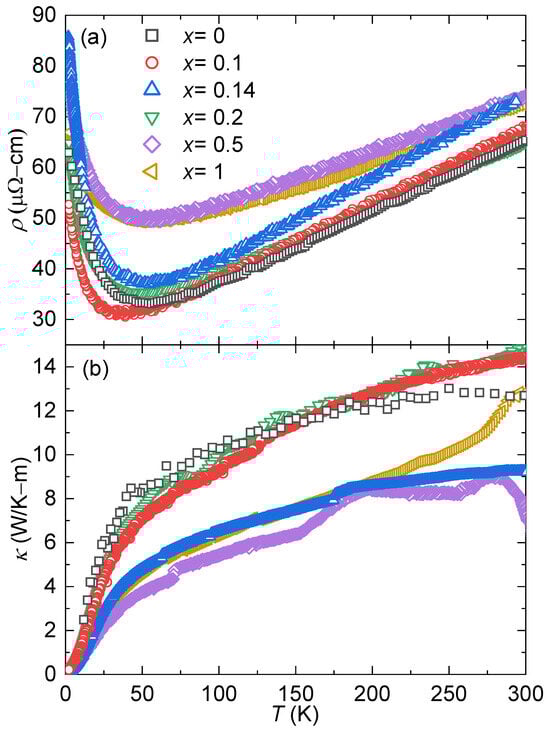 Figure 4a shows the temperature-dependent electrical resistivities of all specimens of Zn20. All the samples show similar behavior, where decreases with increasing temperature for 1.8 K 50 K, and a broad minimum is observed. At high temperatures, K, the specimens exhibit metallic behavior, where increases with increasing temperature. This behavior is consistent with earlier reports, where it was also shown that the parent compound (YbCo2Zn20) exhibited a coherence peak, typical for Kondo lattice systems [51,52,53], below 1.8 K and a sudden drop around 20 mK [43]. It can be seen that a small amount of Ni in the system does not significantly affect the behavior of the electrical resistivity; however, for specimens x = 0.5 and x = 1 (25% and 50% Ni on the Co site, respectively), the value of the minima increases from 30 cm to 50 cm (see Table 1). Figure 4b illustrates the thermal conductivity values for all synthesized specimens. Notably, specimens exhibiting lower thermal conductivity values also demonstrate higher electrical resistivity, except for . Considering that all the specimens are mostly Zn, the lattice thermal conductivity values () are expected to be similar across the doping series.