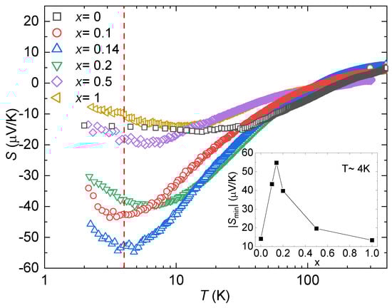 Seebeck coefficient, , for Zn20. The dashed red line indicates K. The inset shows the absolute value of the Seebeck coefficient’s minima as a function of Ni concentration. Note a logarithmic temperature scale.