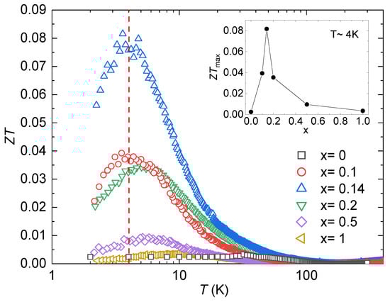 Dimensionless figure of merit, , for Zn20. The dashed red line indicates K. The inset shows the value of the figure of merit’s maxima as a function of the Ni concentration. Note the logarithmic temperature scale.