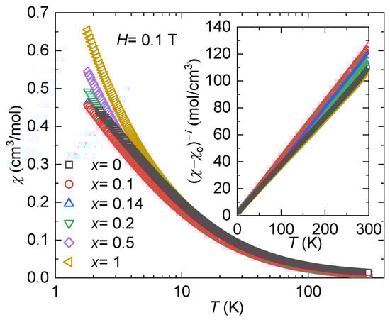 Introducing Ni into the system is a natural way to adjust the carrier concentration since we are changing the number of electrons in the system. However, this type of doping can also affect the hybridization strength by altering the interactions between the conduction electrons and the f-electrons from the Yb. To investigate this effect, temperature-dependent magnetic susceptibility was measured from 1.8 K to 300 K with an applied magnetic field of H = 0.1 T. Figure 7 shows the magnetic susceptibility, , for all specimens for 1.8 K < T < 300 K. At the base temperature, the strength of the magnetic exchange interaction follows the doping series. The inset in Figure 7 shows the inverse of the magnetic susceptibility (), where a temperature-independent contribution to the susceptibility, , is considered. This additional term could have originated from the sample holder core diamagnetism, Pauli paramagnetism, or van Vleck paramagnetism [54,55,56]. Table 1 shows the values used for all the samples. By taking this behavior into account, a modified form of the Curie–Weiss law (Equation (2)) is applied to fit the data at high temperatures (200 K < T < 300 K).