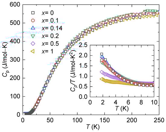Measurements of heat capacity (shown in Figure 8) offer additional understanding regarding the development of electronic hybridization and lattice behavior. For this purpose, the heat capacity data were fitted using a modified lattice-Debye model, where the electronic contribution is included, as expressed in Equation (3) [60]: