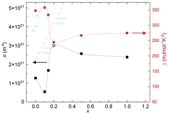 Black squares represent the density of the charge carriers n as a function of the Ni concentration x at a temperature of T= 1.9 K (left y-axis). The open symbol () represents holes as the majority of charge carriers, and the filled symbols (x = 0, 0.14, 0.2, 0.5, and 1) represent electrons as the majority of charge carriers. Red circles represent the Sommerfeld coefficient as a function of x (right y-axis).