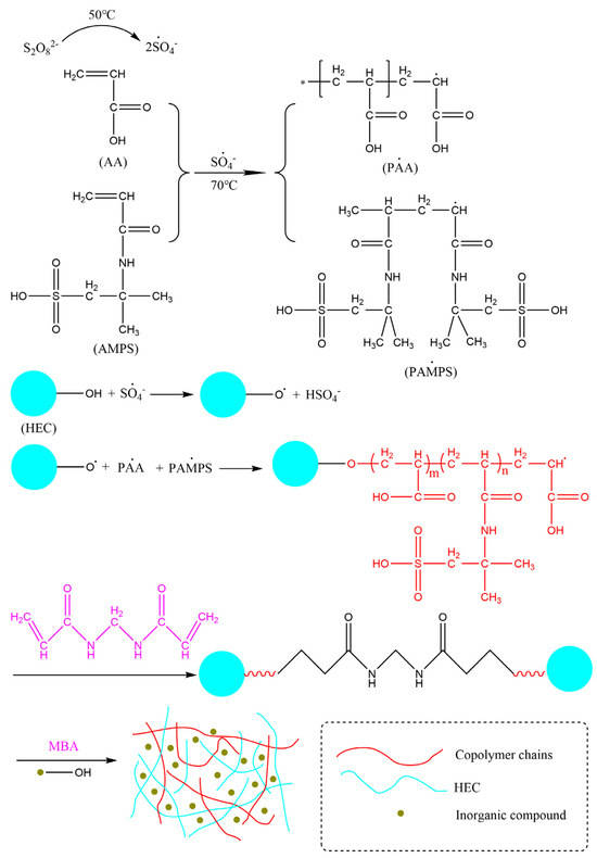 The appropriate amounts of 0.45 g HEC, 0.20 g ATP, 0.05 g SDS, 0.1 g BF, and 30 mL of deionized water were weighed and placed into a three-necked flask under nitrogen protection. The mixture was stirred 70 °C for 45 min to produce a dispersed emulsion, then cooled down to 40 °C, and 5 mL of 8 wt% APS solution was added dropwise. The mixture was stirred for 10 min, then 70% of neutralized AA, 1.42 g APMS, and 0.042 g MBA mixed solution were added. The temperature was raised to 70 °C and the reaction continued for three hours. After completion, the reaction mixture was soaked in ethanol solution for one hour to remove unreacted monomers. The product was transferred to a drying oven at 60 °C until a stable weight was achieved. The dried material was crushed with a pulverizer to produce ATP-BF-P(HEC-AA-AMPS) high-water-absorption polymer powder particles. Figure 1 and Figure 2 show the molecular structure of HEC and the reaction mechanism of the polymerization reaction.