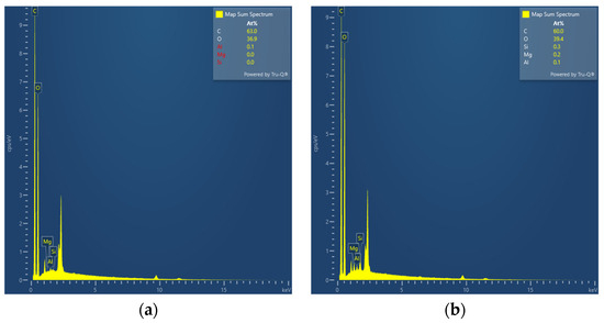 P(HEC-AA-AMPS) and ATP-BF-P(HEC-AA-AMPS) were subjected to EDS tests at the same scanning magnification mainly to measure the changes in the content of the elements C, O, Al, Mg, and Si. Table 3 shows the results of the elemental tests, and Figure 4 shows the EDS energy spectra. It was found that the content of Mg and Si elements in the modified highly absorbent polymer increased significantly, indicating that ATP and BF were successfully doped into the highly absorbent polymer.
