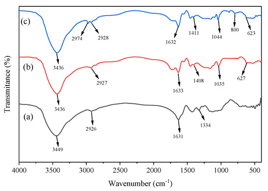 In Figure 5, the infrared spectra of hydroxyethyl cellulose (HEC), P(HEC-AA-AMPS), and ATP-BF-P(HEC-AA-AMPS) are shown. The infrared spectrum of HEC is displayed in curves a, showing the flat vibrational peak of C-OH at 1334 cm−1. The distinct peak at 2926 cm−1 is assigned to the stretching vibration of aliphatic C-H in HEC [24], which is also apparent in graphs b and c. The anticipated peak at 3449 cm−1, corresponding to the telescopic vibration of O-H on HEC, exhibits lower intensity in comparison to curves b and c. This phenomenon arose because the characteristic peaks in curves b and c resulted from the combined effects of O-H and N-H stretching vibrations [25,26]. Within curves b and c, distinctive features include the telescopic vibration peaks of O=S at 627 cm−1 and 623 cm−1, the asymmetric telescopic vibration peaks of C-O-C at 1035 cm−1 and 1044 cm−1, and the asymmetric telescopic vibration peaks of COO- at 1408 cm−1 and 1411 cm−1. These characteristic peaks signify the successful polymerization of P(AA) and P(AMPS) into the HEC backbone [27]. Additionally, the peaks observed at 800 cm−1 in curve c correspond to the bending vibrational peaks of Si-O-Si, while the 2974 cm−1 peaks for C-H stretching in BF confirm the effective incorporation of inorganic materials into the HEC polymer [28].