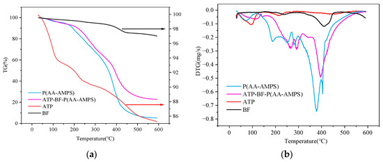 (a) TG curves and (b) DTG curves of ATP, BF, P(HEC-AA-AMPS), and ATP-BF-P(HEC-AA-AMPS).