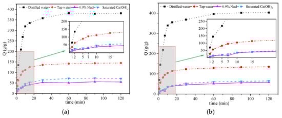 When the pH exceeds 6.0, the electrostatic repulsion on the polymer chain diminishes, impeding network expansion. Simultaneously, the coordination ability between polymer chains strengthens [34]. Consequently, the swelling capacity begins to decrease. Moreover, a further increase in the amount of Na+ reduces the oxygen–sodium ratio on the polymer chain. This leads to a decrease in the coordination between sodium and oxygen, causing a shift in the coordination mode from intramolecular to intermolecular. Consequently, the network of the highly water-absorbent polymer expands further. The comprehensive results indicate that the equilibrium water absorption of the highly water-absorbent polymer remains constant as the pH increases from 7.0 to 10.0. Beyond a pH of 10, the water absorption initiates a decline, potentially attributable to low osmotic pressure and diminished electrostatic repulsion.