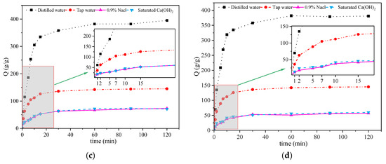 During the experiment, a custom filter bag was used to contain 0.1 g of the polymer sample, which was then submerged in a beaker filled with 500 mL of deionized water, tap water, a 0.9% NaCl solution, and a saturated Ca(OH)2 solution. The specimens were left to equilibrate at temperatures of 20 °C, 30 °C, 40 °C, and 50 °C. Following this, the polymer weight was recorded at intervals of 1, 2, 5, 7, 10, 15, 30, 60, 90, and 120 min. The water absorption ratio was then determined for each temperature by applying a specific equation.