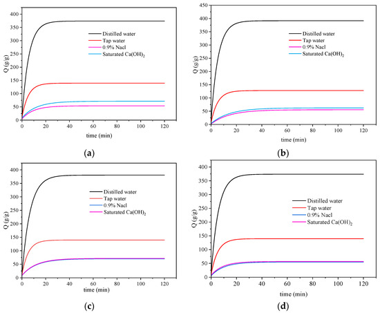 Swelling performance fitting curve: (a) 20 °C, (b) 30 °C, (c) 40 °C, and (d) 50 °C.