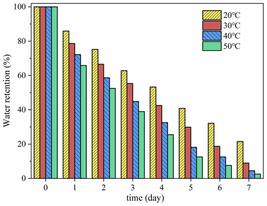 In order to assess the water retention capability of the material ATP-BF-P(HEC-AA-AMPS), it was dissolved until reaching equilibrium at room temperature. Afterward, the water was extracted and moved to a stable-temperature environment in chambers set at 20 °C, 30 °C, 40 °C, and 50 °C, with the weight variations recorded for a period ranging from 1 to 7 days. The water-holding capacity was determined based on Equation (2), and the findings are shown in Figure 9. The water retention performance significantly decreased with increasing temperature, possibly due to the increased water evaporation at higher temperatures. Additionally, the decrease in water retention may have been caused by the deterioration of the resin structure due to prolonged exposure to high temperatures, resulting in a lower ability to absorb water. The water retention rates of the samples at 20°C, 30°C, 40°C, and 50°C on the initial day were 85.91%, 78.65%, 72.18%, and 65.86%. The difference in water retention between 20 °C and 50 °C was 20.05%. Over the course of the testing period, the differences between these temperatures on the 2nd to 7th days increased and then decreased, with values of 22.68%, 23.88%, 27.74%, 28.3%, 24.56%, and 19.03%, respectively. After 7 days of experimentation, the water retention rates under environments of 20 °C, 30 °C, 40 °C, and 50 °C were 23.61%, 9.82%, 4.32%, and 2.36%, respectively, demonstrating the material’s favorable water retention performance under medium-to-low temperature conditions.