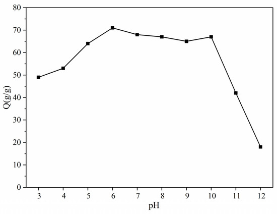 Figure 7 illustrates that ATP-BF-P(HEC-AA-AMPS) achieved a maximum swelling capacity of 71 g/g at a pH of 6.0. The swelling diversity of the samples exhibited a more rapid increase as the pH rose from 3.0 to 6.0. Between pH 6.0 and 10, the swelling diversity exhibited no significant change, but rapidly decreased as the pH increased. The swelling behavior of highly absorbent resins can vary in different pH environments due to factors such as hydrogen bonding, electrostatic repulsion, and coordination along the resin chain. Conversely, electrostatic repulsion and high osmotic pressure contribute to increases in the swelling diversity of the highly absorbent polymers [29,30,31]. At pH levels below 3.0, the H+ in the swelling medium will exchange with the Na+ in the ATP-BF-P(HEC-AA-AMPS) polymer. Simultaneously, the presence of numerous carboxyl groups on the highly absorbent polymer leads to hydrogen bonding between these groups, resulting in a lower swelling multiplication rate. As the pH rises, more acid ions join the chain, leading to increased electrostatic repulsion within the highly absorbent resin network. This, combined with heightened osmotic pressure inside and outside the structure, results in the resin network expanding fully and the equilibrium water absorption rising. While the coordination ability of the highly absorbent resin also increases and the equilibrium water absorption decreases, the primary factors driving the enhanced absorption remain the electrostatic repulsion within the macromolecule chain and the heightened osmotic pressure inside and outside the network. Consequently, the equilibrium water absorption continues to increase [32,33].