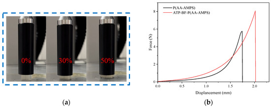 Figure 11a displays field test images of ATP-BF-P(HEC-AA-AMPS) at 0%, 30%, and 50% compressive deformation levels, illustrating a gradual thinning of the samples which was observed visually. Subsequently, Figure 11b presents stress–strain curves of P(HEC-AA-AMPS) and ATP-BF-P(HEC-AA-AMPS) at a 50% deformation level. The graphs indicate that the maximum positive stress of the water-absorbing polymers increased from 5.74 N to 8.07 N with the addition of ATP and BF, resulting in a notable 40.59% improvement in mechanical properties. Additionally, at the same level of positive stress, the deformation of the modified polymer was smaller. For instance, the deformation before and after modification was 1.631 mm and 1.701 mm at 4 N, corresponding to compressions of 46.71% and 42.19%, respectively. This demonstrates that the incorporation of ATP and BF enhances the strength and stability of the polymer structure, rendering it more suitable for application in challenging environments.