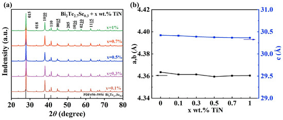 (a) X-ray diffraction (XRD) patterns and (b) corresponding lattice parameters of the Bi2Te2.7Se0.3 + x wt.% TiN samples.