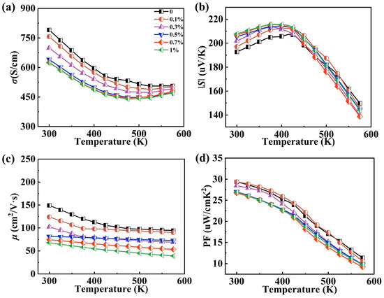 As demonstrated in Figure 4a,b, with the addition of TiN, the conductivity decreases while the Seebeck coefficient remains unchanged. Specifically, at 300 K, the electrical conductivity decreases from 790 S/cm to 624 S/cm for x = 1% compared to x = 0%.