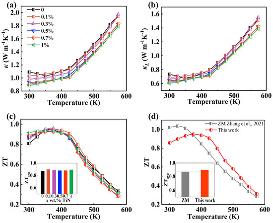 where C, v and l denote the specific heat capacity per unit volume, average phonon velocity and average free range of phonons, respectively. Notably, the phonon mean free range plays a pivotal role in determining the thermal conductivity of the material’s lattice, particularly in cases where the material is crystalline. Grain boundaries serve as effective scatterers of phonons, and as the grain size decreases, the number of grain boundaries increases. Consequently, more intense phonon scattering occurs, leading to a diminished mean free range. This reduction in mean free range contributes to a decrease in lattice thermal conductivity [29,32,33]. Furthermore, the TiN nanoparticles also have the ability to scatter phonons [34], which intensifies with increasing TiN additions. This results in a reduction in the phonon mean free range and a decrease in the lattice thermal conductivity. The combination of these two mechanisms leads to the observed decrease in lattice thermal conductivity, consistent with the changes shown in Figure 5b. The reduction in lattice thermal conductivity ultimately results in a decrease in thermal conductivity.