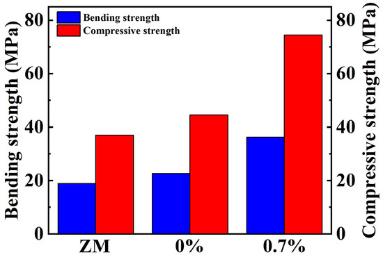 The increase in bending strength and compressive strength can be attributed to two factors. Firstly, this is due to the grain refinement provided by the optimized ball milling and SPS processes, which increases the strength of the samples with no added TiN compared to the ZM ingots. And then, the combination of the grain refinement provided by the TiN and its own pinning effect results in a significant increase in the strength of the samples.