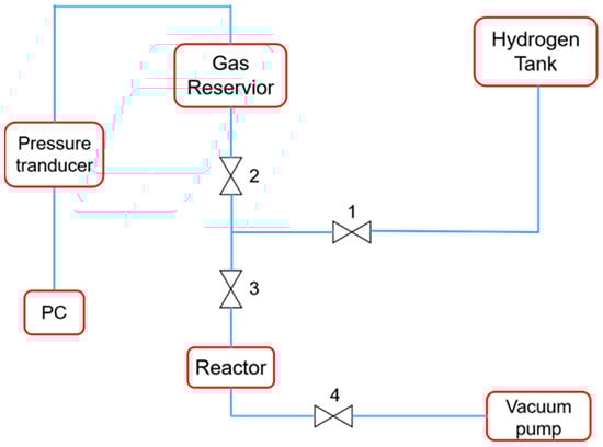 A homemade apparatus is shown in Figure 3 for conducting absorption tests in pure H2 atmospheres. By using an L300500i helium mass spectrometer leak detector (Leybold, Koln, Germany), it was determined that the leakage rate of the apparatus was less than 10−9 Pa m3/s, which was suitable for the test. The sample was placed in a stainless-steel reactor (Xuwei Technology Inc., Chengdu, China) with a 100 mL volume; the reactor was then closed and a vacuum was applied to the apparatus (Valve 1 off, with 2, 3, and 4 on). When the internal pressure of the gas reservoir was pumped to 100 Pa, the vacuum pump and the reactor were disconnected (valves 4 and 3 off), and H2 from the hydrogen tank was slowly introduced to the device (Valves 1 and 2 on) until the internal pressure reached 200 KPa. Then, the reactor was reconnected (Valve 1 off and 3 on) and H2 was introduced into the reactor. The data acquisition software (SUPY1.0, 2015, Simingte Inc., Hangzhou, China) was then used to record and analyze the data. The pressure change was recorded as a function of time, and the capacity (volume of hydrogen absorbed per SR or catalyst weight, mL/g) was calculated from the pressure drop according to the ideal gas equation (Equation (1)):
